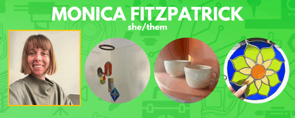 “I love pushing the boundaries of what’s expected from an art form and experimenting with new crafts and techniques. I’ve been a quilter for many years, a stained glass artist for a couple years, and I recently started working in pottery and woodworking. I’m constantly thinking about how I can grow these skills and combine them in new and exciting ways.”