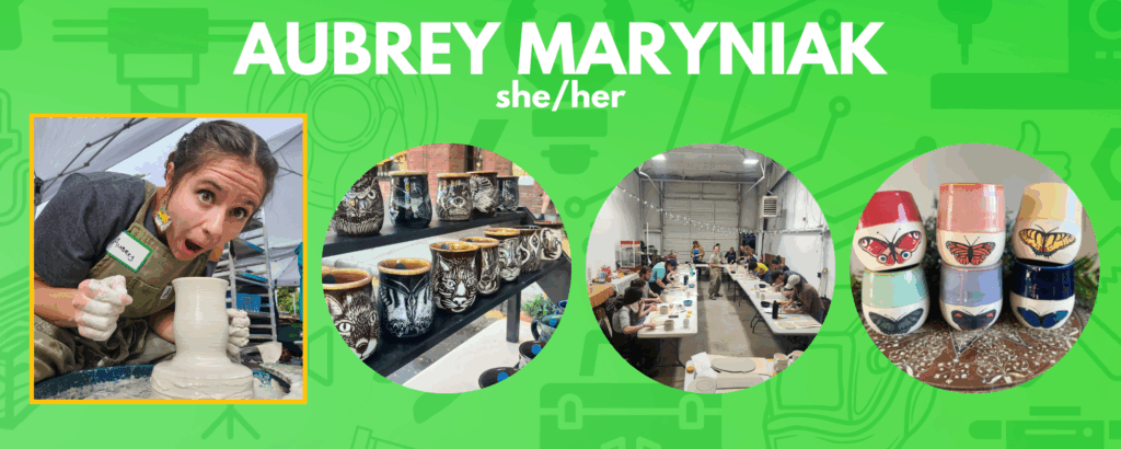 “I’m one of the pottery shop captains! Back in 2021 I had been looking for a place to pick ceramics back up after a break between covid shutdowns taking away my space and then moving to Colorado, and eventually landed at Tinkermill. After the morning of my pottery certification class, I stayed and played in the studio until midnight and that’s when I knew I was hooked. Pretty soon after I was (very willingly) recruited as a shop captain, and the rest is history! I continue to receive new ways to breach my comfort zone in the space, from learning to make glaze to teaching to curating events to help give back to an entity that has given me so much.